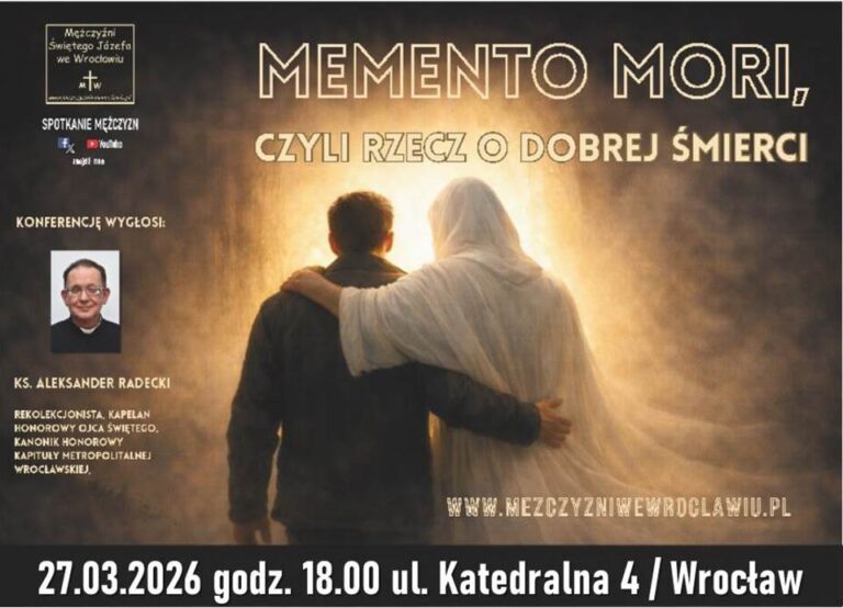 Zapraszamy w marcu na spotkanie Mężczyzn Św. Józefa Temat: „Memento mori, czyli rzecz o dobrej śmierci”. Konferencję wygłosi: ks. Aleksander Radecki – rekolekcjonista, kapelan honorowy Ojca Świętego, kanonik honorowy Kapituły Metropolitalnej Wrocławskiej, penitencjarz katedralny; felietonista. Pewnie wiesz, jak żyć…. A czy wiesz jak dobrze umrzeć? Jak pomóc komuś urodzić się…