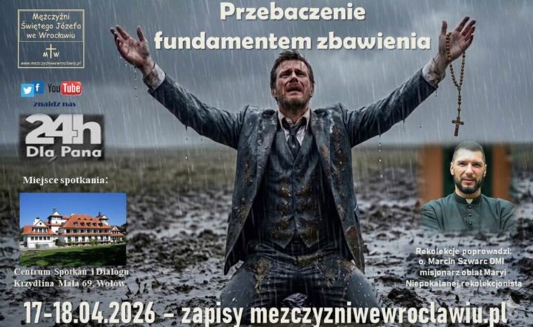 Zapraszamy na spotkanie z cyklu „24h dla Pana” – Dzień Odnowy Duchowej Mężczyzn w Krzydlinie Małej, niedaleko Wołowa. Rozpoczęcie: 17/04/2026 (piątek) godz. 18:00 Zakończenie: 18/04/2026 (sobota) godz. 18:00 Temat: „Przebaczenie fundamentem zbawienia”. Rekolekcje poprowadzi dla nas: o. Marcin Szwarc OMI – misjonarz oblat Maryi Niepokalanej, rekolekcjonista. Przykrości, zranienia, niegodziwości, krzywdy…