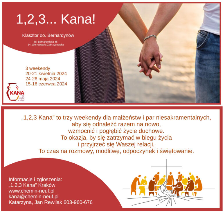 „1,2,3 Kana” to trzy weekendy dla małżeństw i par niesakramentalnych, aby się odnaleźć razem na nowo, wzmocnić i pogłębić życie duchowe. To okazja, by się zatrzymać w biegu życia i przyjrzeć się Waszej relacji. To czas na rozmowy, modlitwę, odpoczynek i świętowanie. 3 weekendy 20-21 kwietnia 2024 24-26 maja 2024…