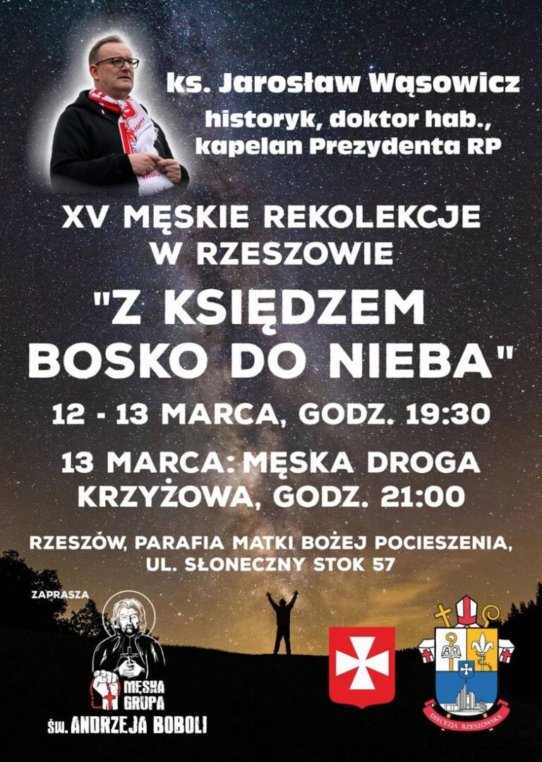 Zapraszamy na rekolekcje dla mężczyzn pod hasłem "Z księdzem Bosko do Nieba" w rzeszowskiej parafii Matki Bożej Pocieszenia. Rekolekcje poprowadzi ks. Jarosław Wąsowicz. 12 - 13 marca, godz. 19.30 13 marca, godz. 21.00 - Męska Droga Krzyżowa Artykuł o rekolekcjach: https://radiovia.com.pl/informacje-z-diecezji/15-edycja-meskich-rekolekcji-z-ksiedzem-bosko-do-nieba