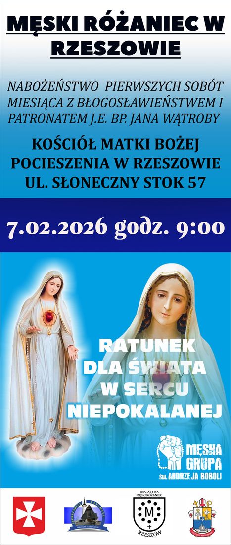 ZAPRASZAMY DO WSPÓLNEJ MODLITWY Następny Męski Różaniec w Piotrkowie Trybunalskim Odbędzie się w dniu 07 lutego 2026 r. (pierwsza sobota miesiąca) Początek: godz. 10:00 pod kościołem Najświętszego Serca Jezusowego (od ul. Słowackiego)