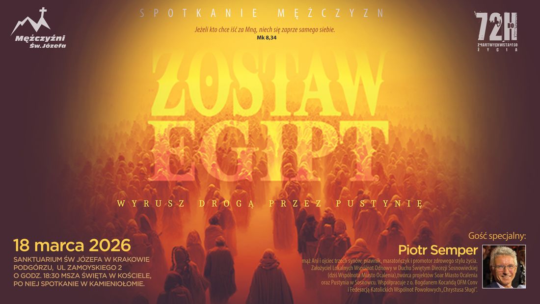 W środę 18 marca 2026 odbędzie się kolejne spotkanie otwarte Mężczyzn Świętego Józefa w Krakowie. Naszym gościem będzie Piotr Semper. Podzieli się z nami tematem: “Zostaw Egipt. Wyrusz drogą przez Pustynię.”